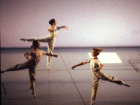 最近先後來台的美國劇場導演羅伯威爾森( Bob Wilson )與作曲家菲利普葛拉斯( Philip Glass ), 1976 年合作的歌劇作 品 《 沙灘上的愛因斯坦 》無論是在戲劇史上或音樂史上都是驚人的里程碑 。但是劇中,另一個以繁複肢體動作與舞台視覺效果,將整體戲劇結構推向思維層次的功臣,就是 Lucinda Childs 。三年後, Philip Glass 再度為她 作曲。 Lucinda Childs 的舞者以 令人懾目的精簡與迷炫的繁複同時並存的肢體在舞台上旋轉。極簡主義畫家 Sol Lewitt 事先將舞作以影片拍下。表演時, 在空無一物舞台上,以穿透的方式多銀幕投影,影像與真實的 舞者或交疊或分離地撞擊在觀眾的眼珠前。強烈的衝擊力在觀眾的視覺 – 聽覺 – 觸覺 – 幻覺間流竄,最後達到視而不見的冥想境界。 這個舞作被認為是當代舞蹈史上的最高峰,與它不斷重回原點的肢體動作一樣,標題就叫《舞蹈》。